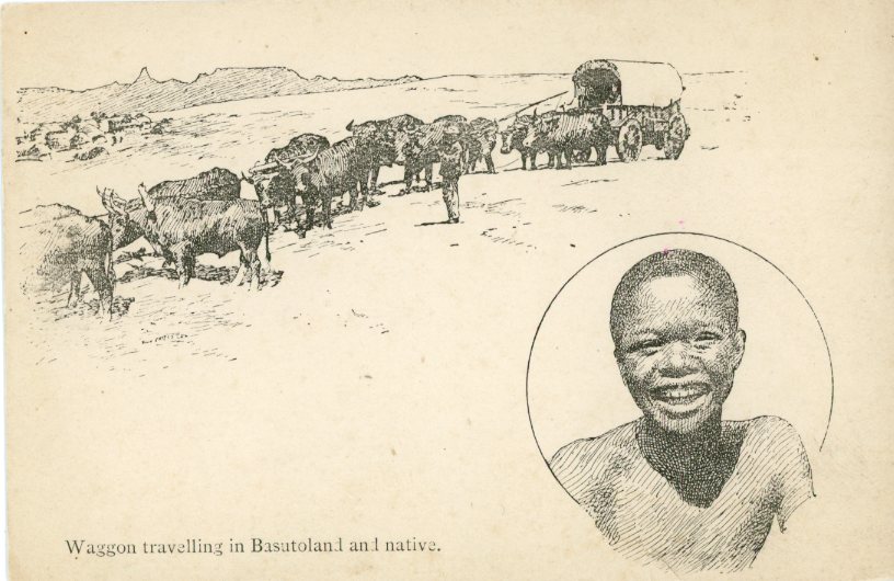 Lesotho – Basutoland: Unused postcard titled ‘Waggon travelling in Basutoland and native’. ed. Morija printing #12
