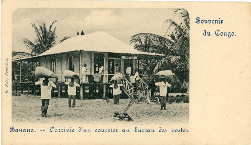 Belgian Congo: Unused postcard titled ‘Banana – L’arrivee d’un courrier au bureau des postes’.