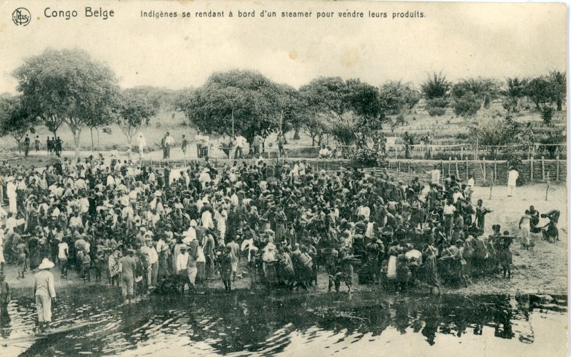 Belgium Congo: Unused postcard titled ‘Indigenes se rendant a bord d’un steamer pour vendre leurs prodoits’.