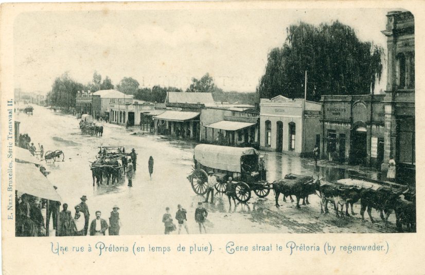 South Africa – Boer War: Unused postcard of Pretoria in rainy weather. Ox Carts
