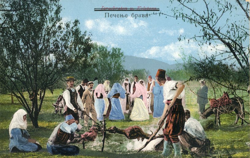 Bosnia: Unused postcard of Kolo Dance and Roasting Lamb.