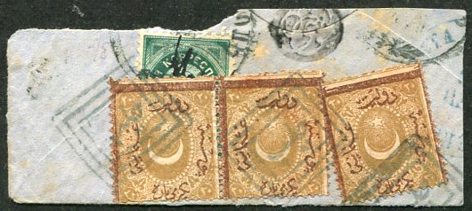 Ottoman Empire: circa 1868 large piece with single and a pair of 20pa brown border perf. 13 1/4 Dulos stamps over 2k Russian stamp tied by triple boxed Galata 81 handstamps and part Russian cds.