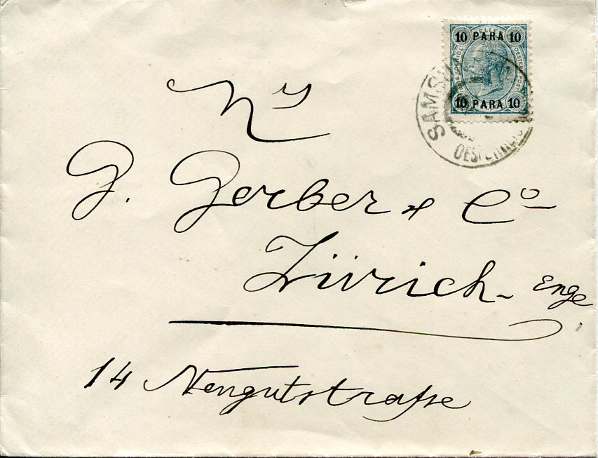 Austria Levant: c.1900 cover to Switzerland franked with 10 Para Turkish currency surcharged on 5h Austrian stamp tied by Samsoun datestamps. Reverse blank.
