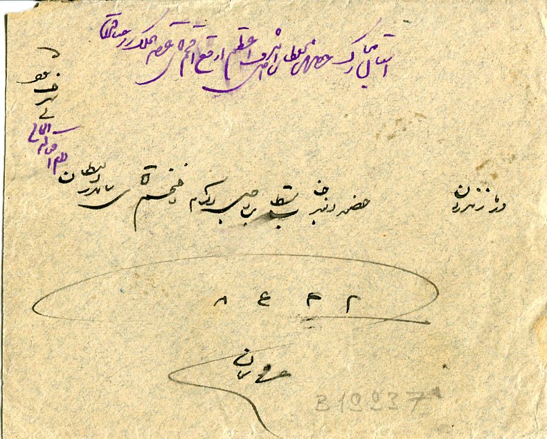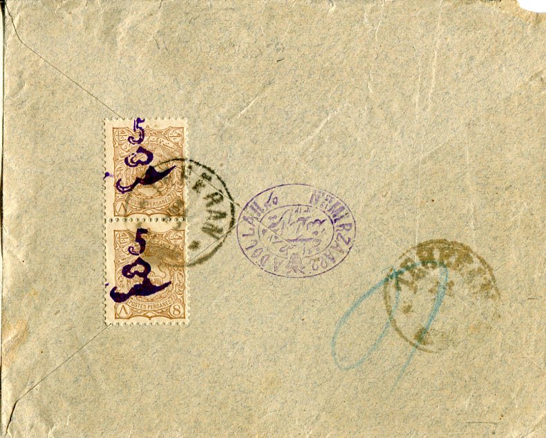 Iran: c1900 (24 November). Cover with its content franked with pair of 5ch handstamped on 8ch revalued issue tied by Tehran datestamps and merchant cachet.