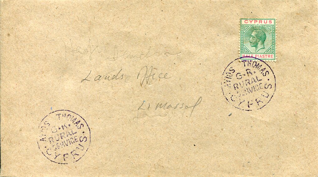 Cyprus: c1912 cover to Limassol franked with 1/2pi KGV portrait and tied by AYIOS THOMAS G.R. Rural Service handstamp.