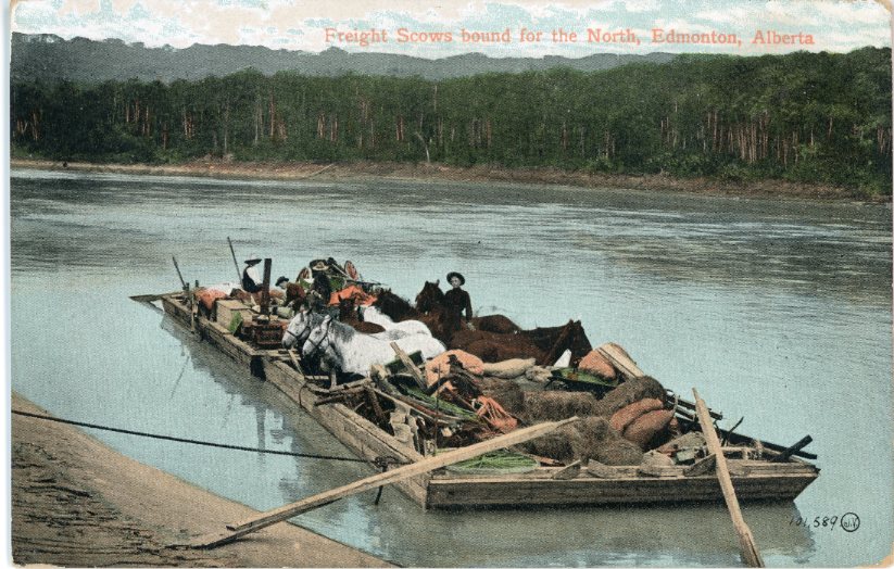 Canada: Unused postcard titled ‘Freight Scows bound for the North, Edmonton’. ed. The Valentine & Sons