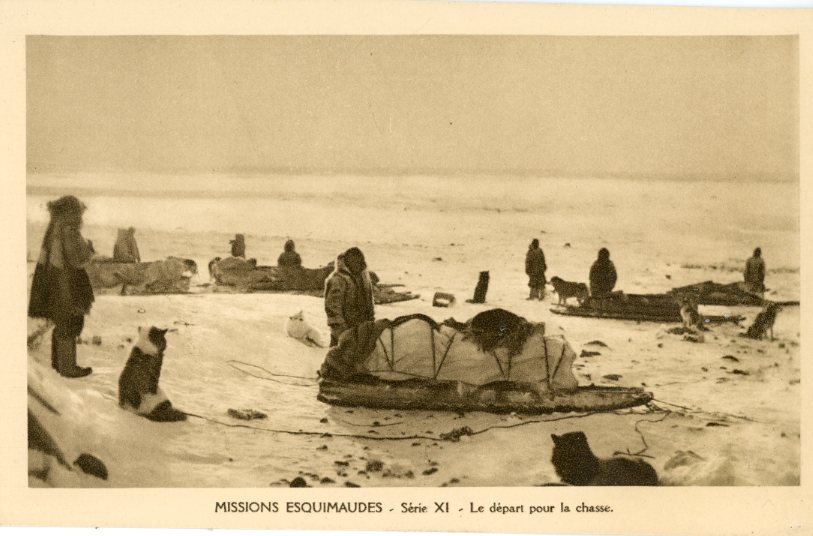 Unused postcard titled ‘Missons Esquimaudes. Le depart pour la chasse’.
