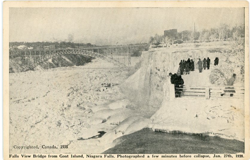 Canada: Unused postcard titled ‘Falls View Bridge from Goat Islan, Niagara Falls. Photographed a few minutes before collapse, Jan. 27th. 1938’. ed. F.H. Leslie