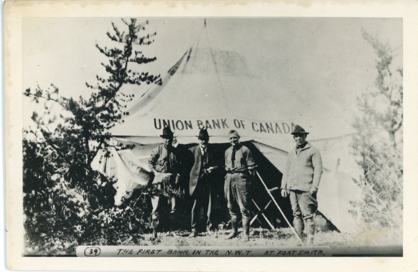 Unused photo postcard titled ‘The First Bank in the N.W.T. at Forth Smith’.