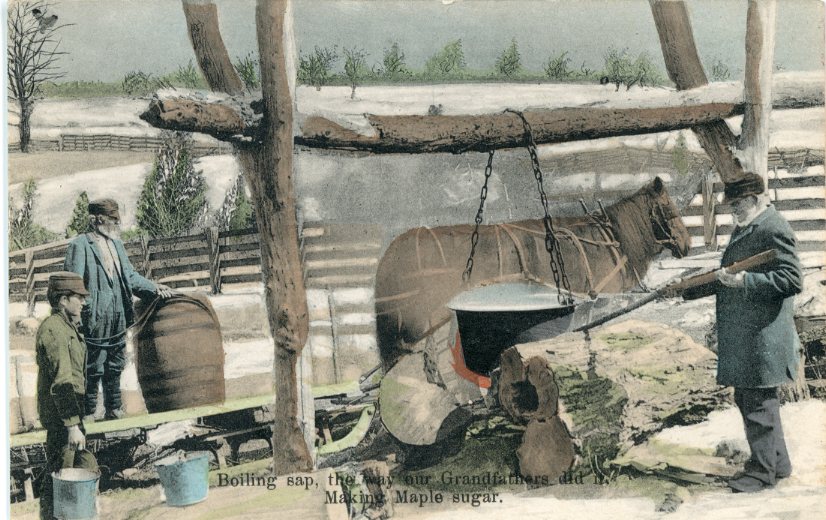 Canada: Unused postcard titled ‘Boiling sap, the way our Grandfathers did it. Making Maple Sugar’. ed. Green Mountain Card Co # 11