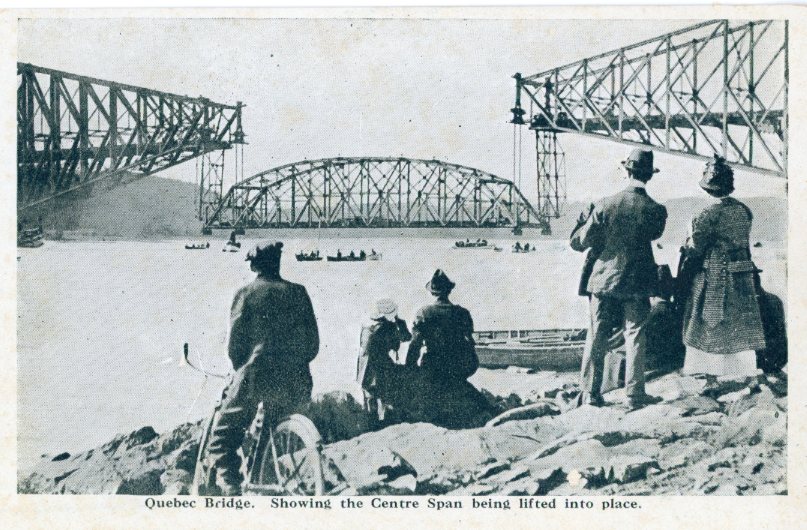 Canada: Unused postcard titled ‘Quebec Bridge. Showing the Centre Span being lifted into place’. ed. Novelty Mtg & Art