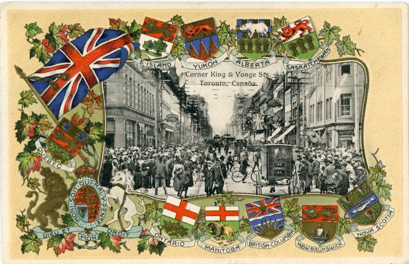 Unused embossed postcard titled ‘Corner King & Yonge Sts. Toronto’.