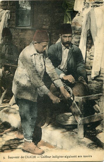 Cilicia: Unused postcard titled ‘Cilicie – Coiffeur indigene aiguisant ses rasoirs’. Reverse large exhibitor/owner cachets. ed. K. Papadopoulos