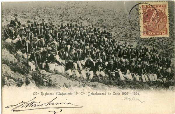 Crete – Greece: 1904 postcard titled ‘122e Regiment d’Infanterie 15e Compagnie Detachement de Crete 1903-1904’ from Chania to Napoli. ed. E.A. Cavaliero