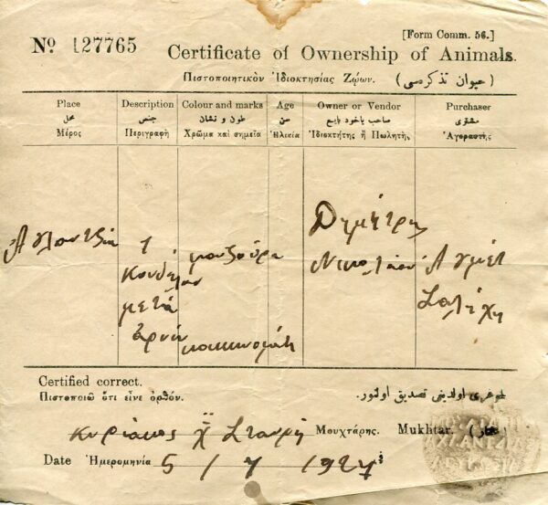 Cyprus: 1927 certificate of ownership of Animals struck by black G.R. AGLANTZIA (also Eglence) Greek Mukhtar seal of Nicosia.
