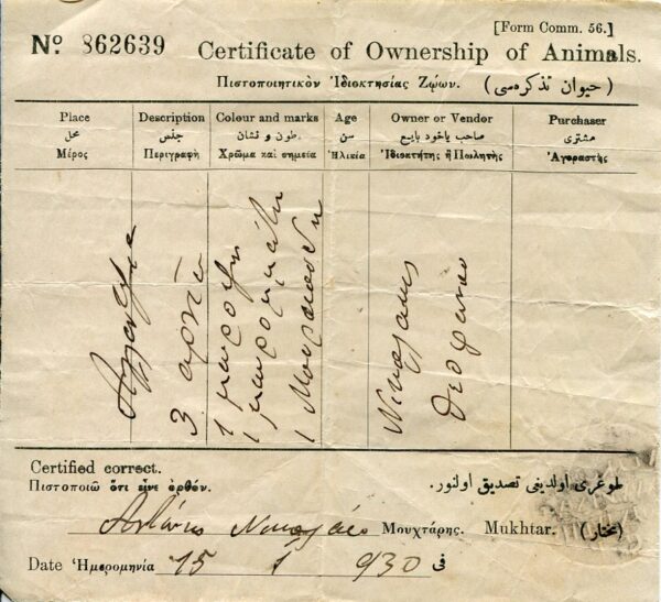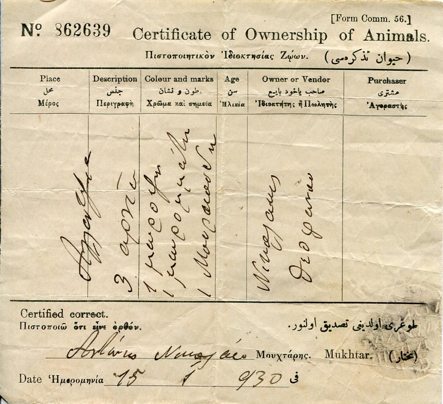 Cyprus: 1930 certificate of ownership of Animals struck by black G.R. AGLANTZIA (today Eglence) Greek Mukhtar seal of Nicosia.