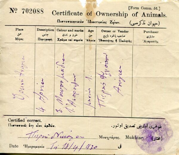 Cyprus: 1930 Certificate of Ownership of Animals struck by V.R. ANAYIA of Nicosia Mukhtar seal.