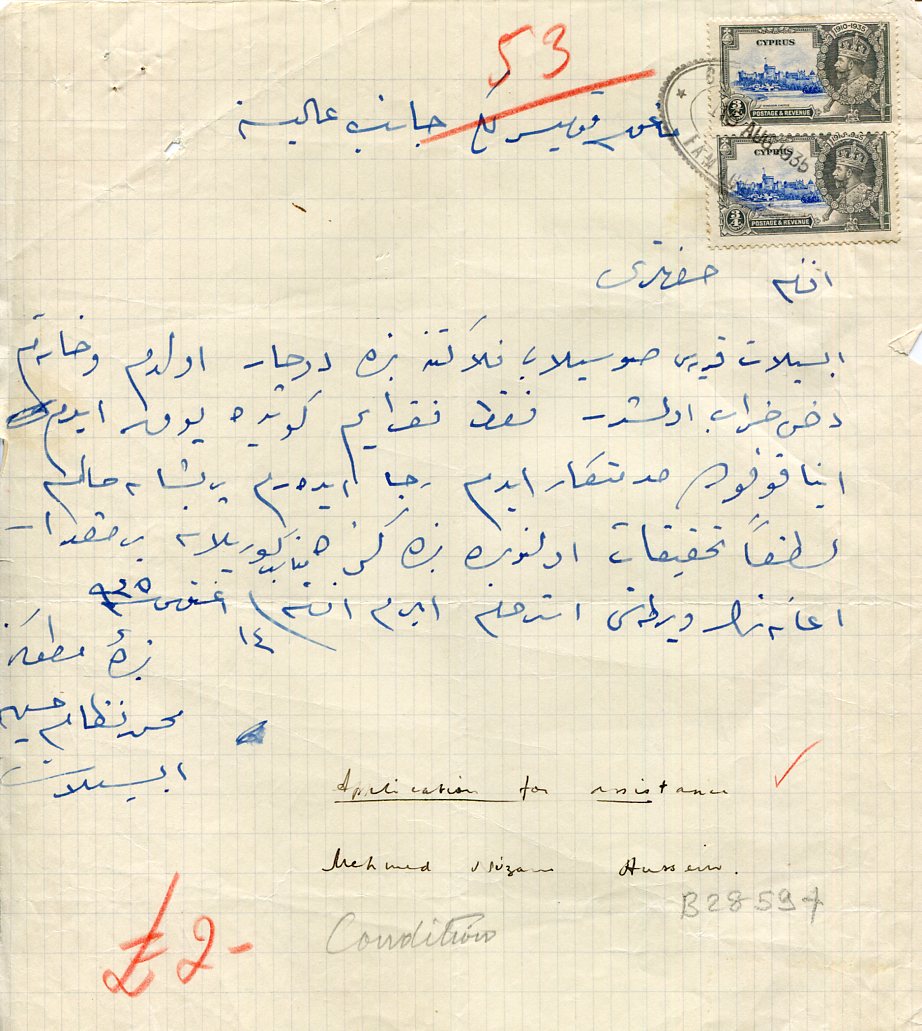 Cyprus: 1935 document from Famagusta written in Ottoman Turkish franked with two 3/4pi Silver Jubilee stamps.