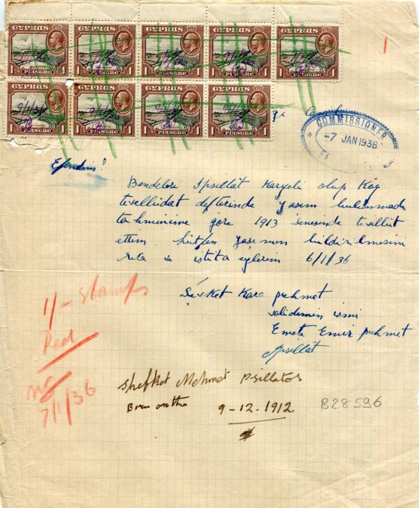Cyprus: 1936 document from Famagusta written in Turkish franked with block od 9 KGV pictorials.
