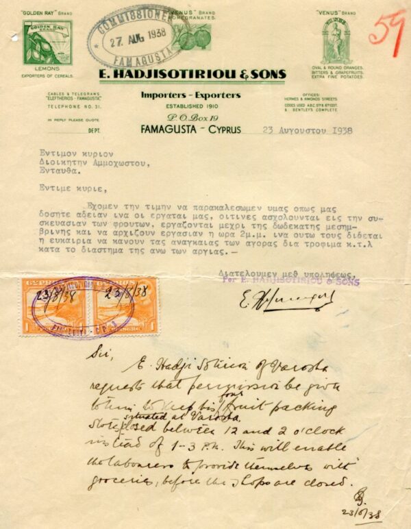 Cyprus Famagusta Fruit Importer 1938 Doc.