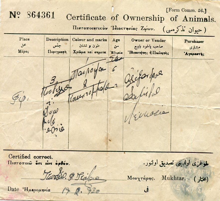 Cyprus: 1930 Certificate of Ownership of Animals struck by V.R. GOURRI of Nicosia Mukhtar seal.