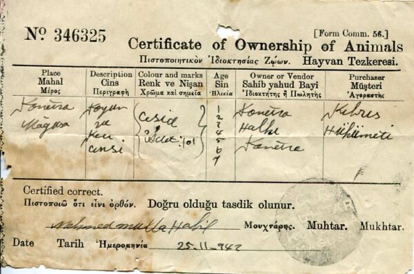 Cyprus: 1942 Certificate of Ownership of Animals struck by G.R. MUHTAR / KONDEORA / MAGUSA (today Türkmenköy) of Famagusta Mukhtar seal in modern Turkish.