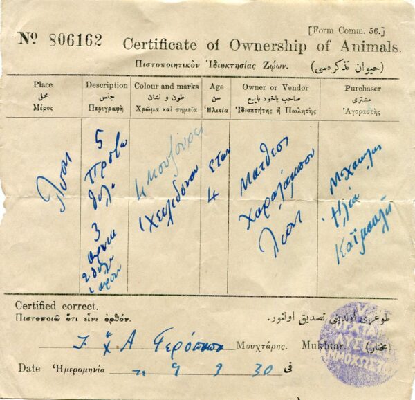 Cyprus: 1930 certificate of ownership of Animals struck by V.R. Lysi Mukhtar seal of Famagusta.