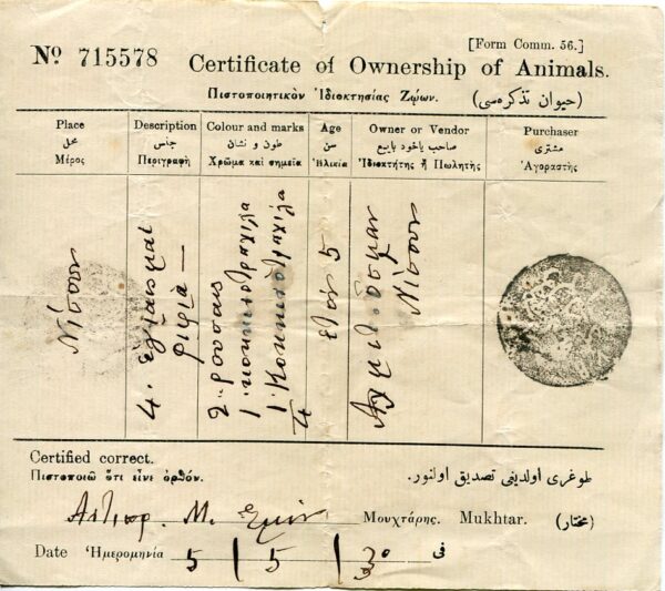 Cyprus: 1930 Certificate of Ownership of Animals struck by V.R. NISOU (today Dizdarköy) of Nicosia Mukhtar seal in Ottoman Turkish.