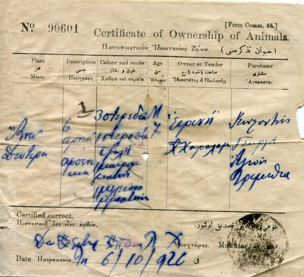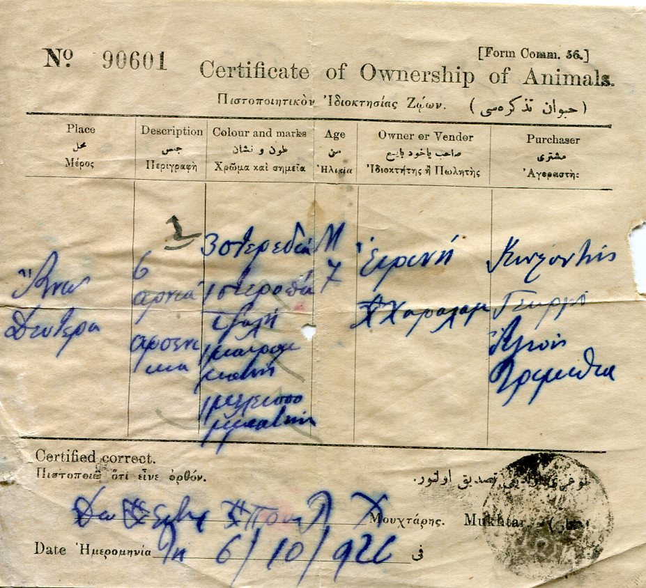 Cyprus: 1926 Certificate of Ownership of Animals struck by V.R. PANO DEFTERA of Nicosia Mukhtar seal.