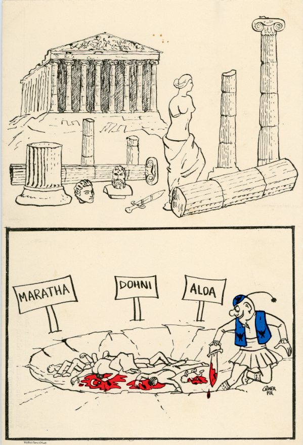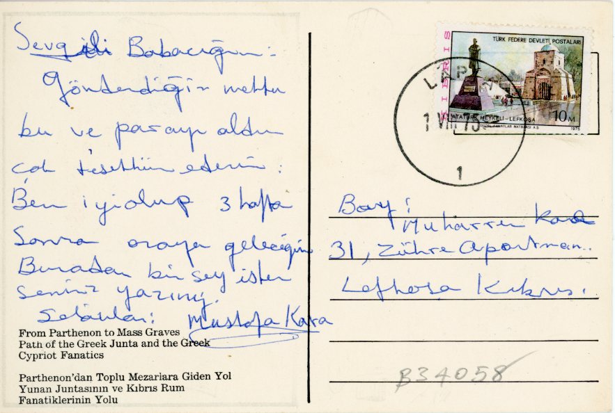 Turkish Cyprus: 1975 propaganda postcard from Lapta to Lefkosa titled ‘From Parthenon to Mass Graves Path of the Greek Junta and the Greek Cypriot Fanatics’.