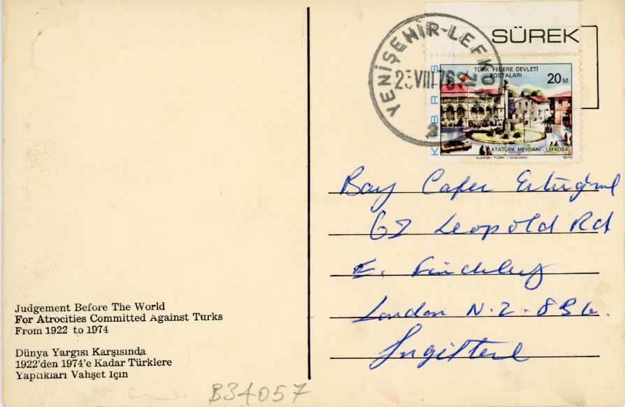 Turkish Cyprus: 1976 propaganda postcard to England titled ‘Judgment Before The World For Atrocities Committed Against Turks From 1922 – 1974’.