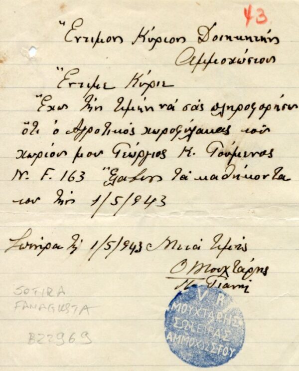 Cyprus: 1943 small document struck by V.R. SOTIRA Mukhtar seal.