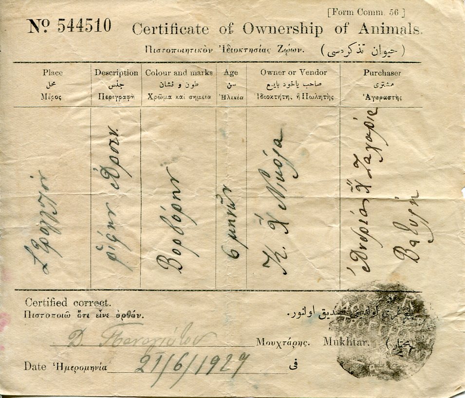 Cyprus: 1929 certificate of ownership of Animals struck by black E.R. STRONGYLOS (today Turunçlu) Greek Mukhtar seal of Famagusta.
