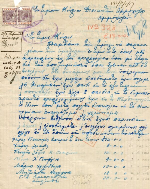 Cyprus: 1932 two pages petition from Varosha village franked with pair of KGV 1pi and tied by Famagusta Commissioner date cachet and PAID handstamp.