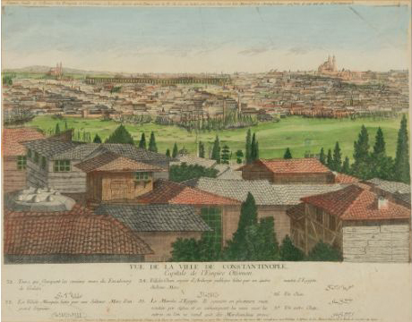 Turkey: c.1760 original hand painted gravure of Istanbul from a panorama after Gudenus engraved by Thelot mounted on thick card with frame. Overall size 390 x 500mm