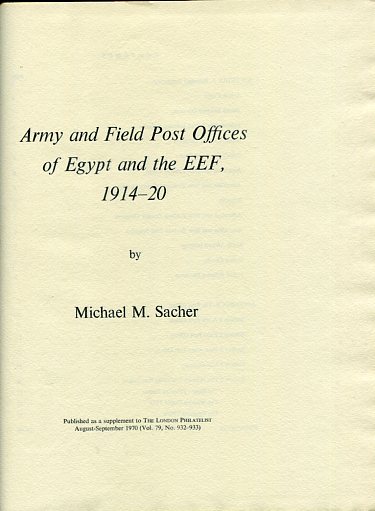 Egypt: Army and Field Post Offices of Egypt and the EEF, 1914-20 by Michael M. Sacher, originally published as a supplement to London Philatelist, 1970, 36 pages and 2 loose addendum pages. Printed on hand made paper and half leather bound. Pencil notation with signature “One of two copies on handmade paper, September 1970”.