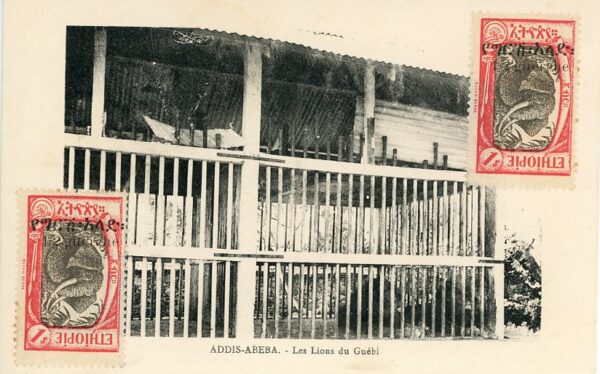 1926 postcard to Djibouti titled ‘Addis Abeba – Les Lions du Guebi’