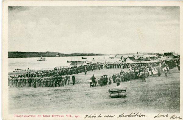Falkland Islands: Postcard titled ‘Proclamation of King Edward VII, 1901’ to England. Stamp removed.