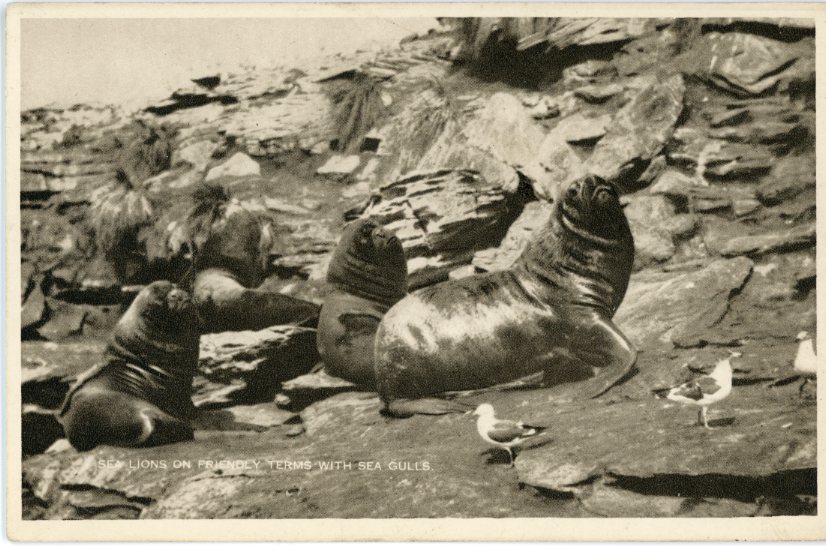 Falkland Islands: Unused postcard titled ‘Sea Lions on Friendly Terms with Sea Gulls’. ed. T & N Binnie