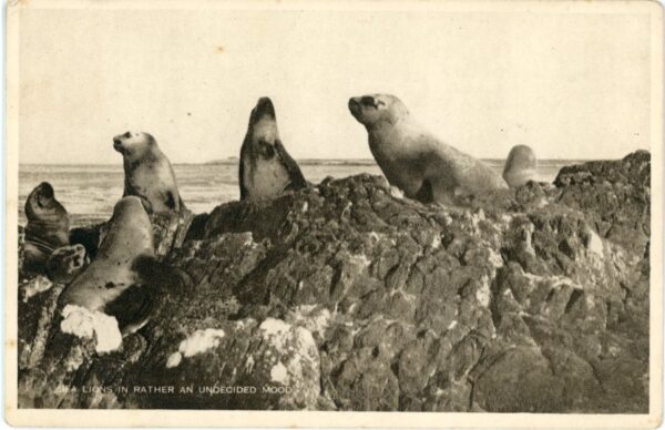 Falkland Islands: Unused postcard titled ‘Sea Lions in Rather Undecided Mood’. ed. T & N Binnie