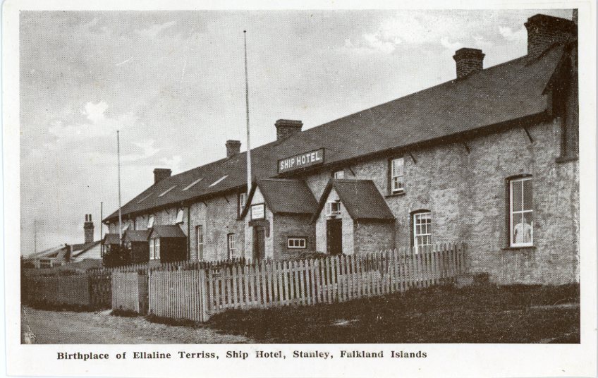 Falkland Islands: Unused postcard titled ‘Birthplace of Ellaline Terriss, Ship Hotel, Stanley’. ed. Kelper Stores