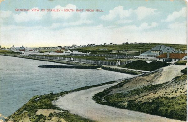 Falkland Islands: Unused postcard titled ‘General View of Stanley South East from Hill’.