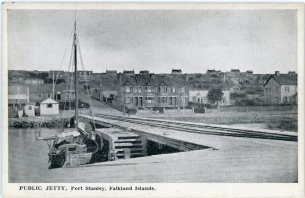 Falkland Islands: Unused postcard titled ‘Public Jetty, Port Stanley’.