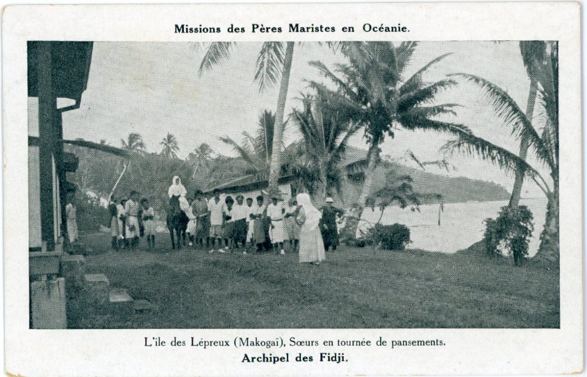 Fiji: Unused postcard titled ‘L’ile des Lepreux (Makogai), Soeurs en tournee de pansements’ by Missions de Peres Maristes en Oceanie
