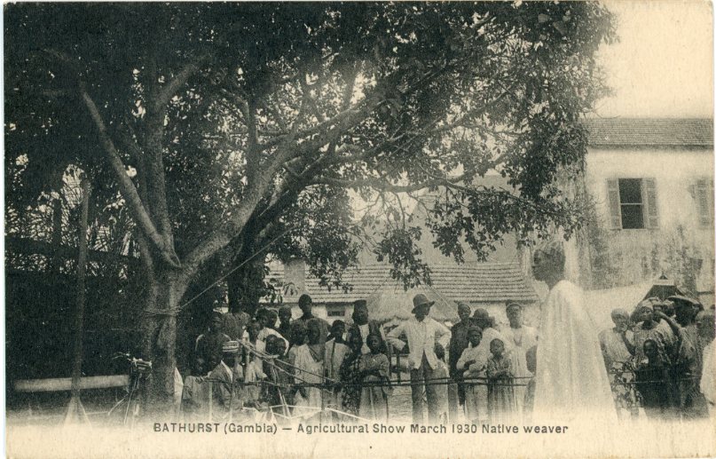 Gambia: Unused postcard titled ‘Bathurst – Agricultural Show March 1930 Native weaver‘.