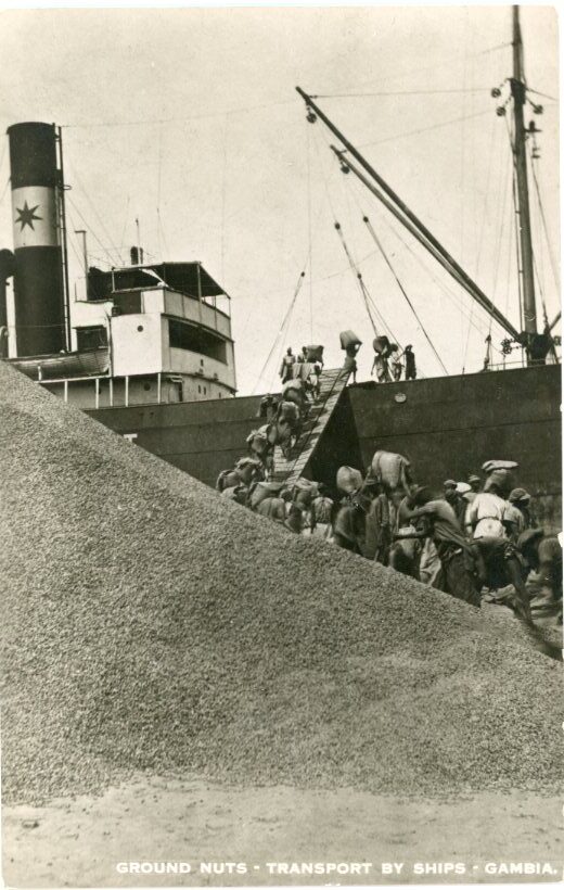 Gambia: Unused photo postcard titled ‘Ground Nuts – Transport by Ship‘. published by Imperial Institute, London