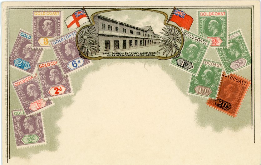 Ghana – Gold Coast: Unused Basel Mission Factory vignette inserted KEVII stamps postcard.