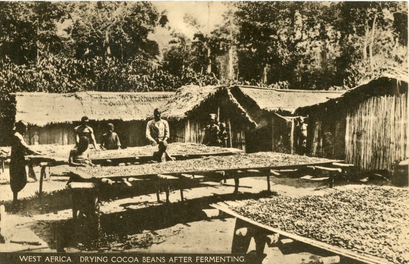 Ghana – Gold Coast: Unused postcard titled ‘Drying Cocoa Beans After Fermenting’.