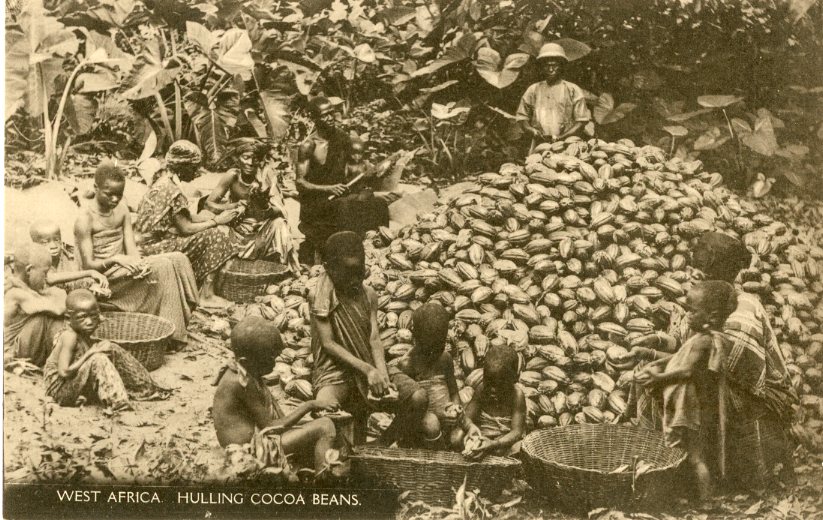 Ghana – Gold Coast: Unused postcard titled ‘Hulling Cocoa Beans’.