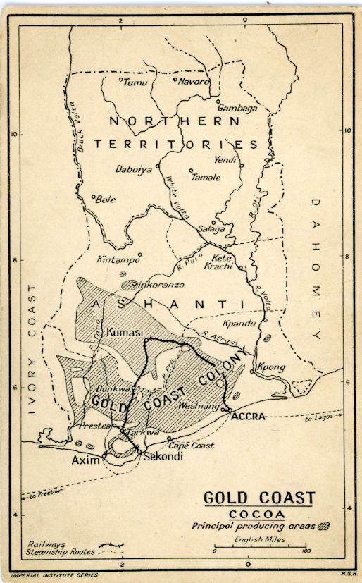 Ghana – Gold Coast: Unused Map postcard of Cocoa producing areas.